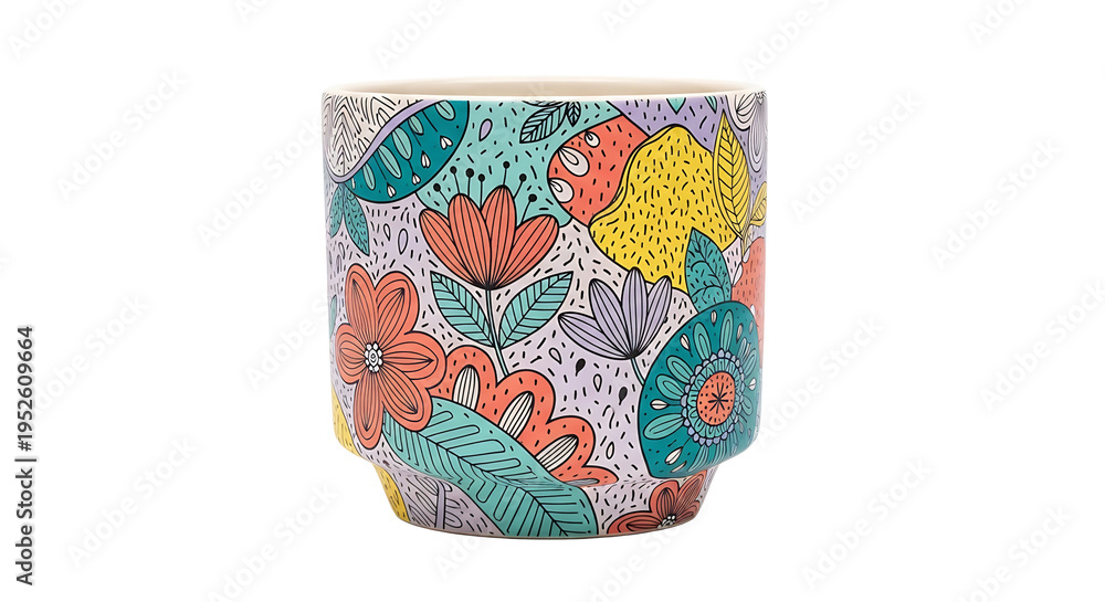 A colorful floral patterned cup in the style of Naive Art on transparent background #1952609664