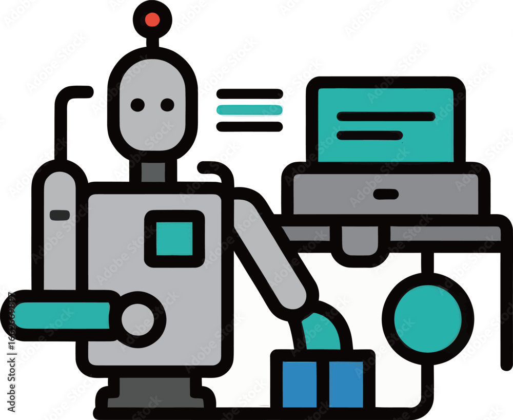 A colorful illustration features a cartoon-style robot interacting with a computer in a sleek workspace. The robot appears to assist in tasks, symbolizing the collaboration between technology and huma #1662669897
