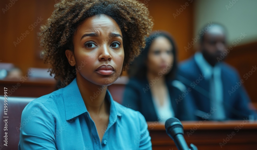 A courtroom scene with the judge sitting in his bench and an scared An African-American woman wearing blue shirt beingKitb . #1295999917