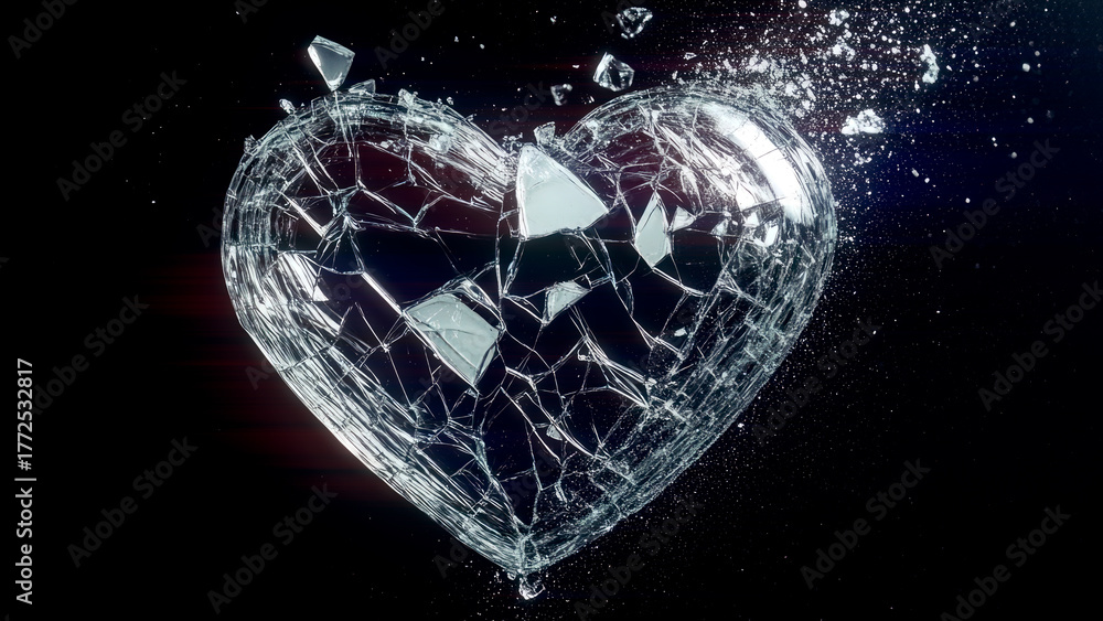 A crystalline heart covered with cracks, with bright glints of light, disintegrates into tiny shards. These elements add a sense of destruction and beauty to the illustration #1772532817