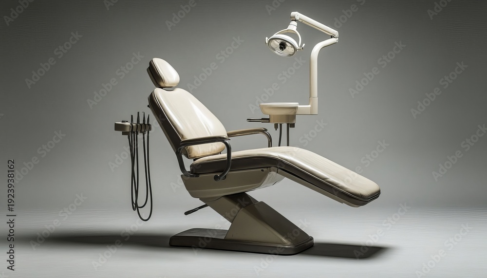 a dental chair designed for patient comfort, featuring adjustable elements for ease. The dental chair is equipped with tools and lighting for precise work. #1923938162