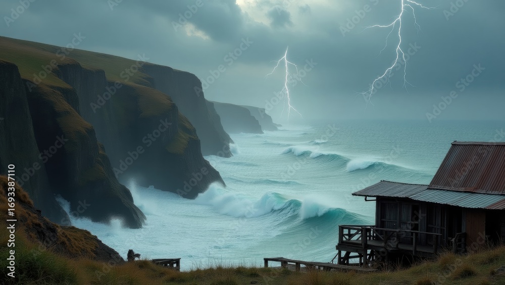 A dramatic windswept coastal bay with steep rocky cliffs plunging into the turbulent sea #1693387110