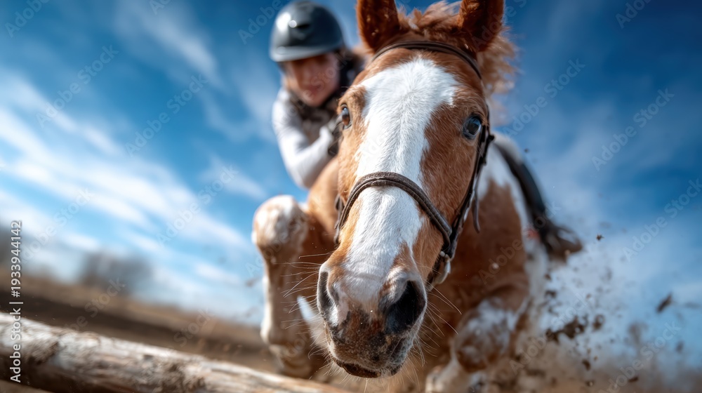A dynamic photograph captures a horse enthusiastically jumping over a barrier with a rider, emphasizing the synergy between the horse and rider in an exhilarating outdoor setting. #1933944142