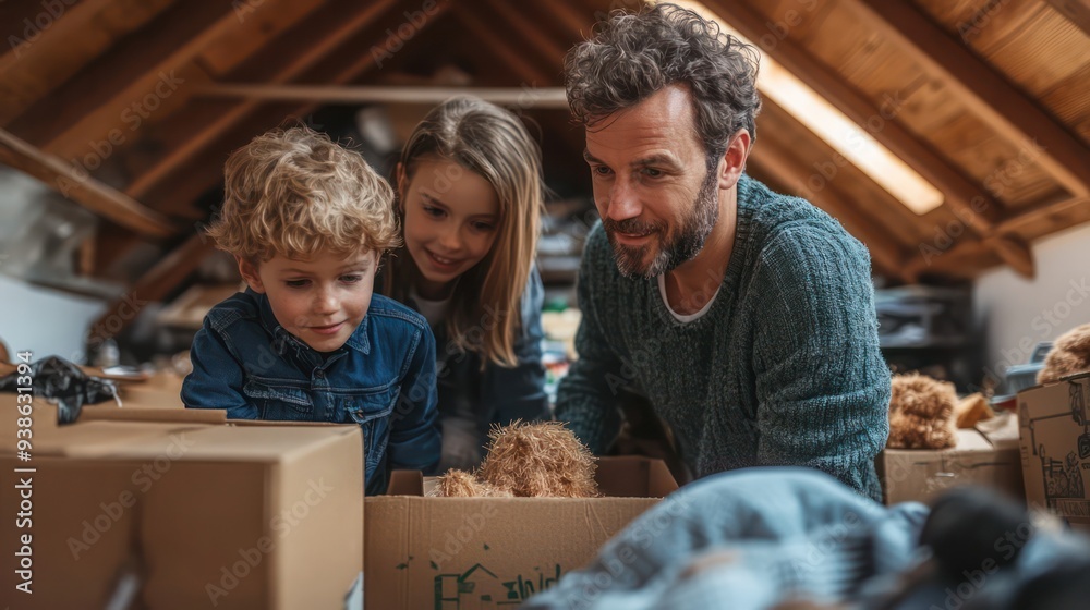 A family working together to organize the attic, with each member sorting through boxes and items to create a clean and organized space. #938631394