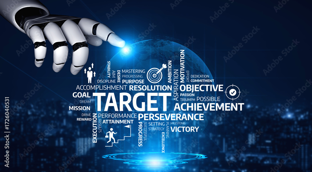 A futuristic robotic hand reaches for concepts of achievement, featuring terms like target and motivation in a dynamic digital landscape, symbolizing success and innovation. Tessel #1726040531