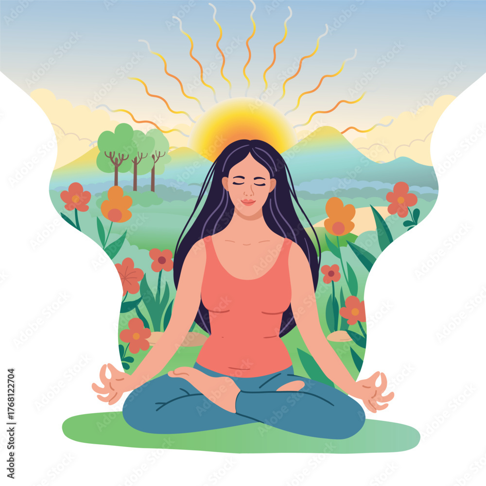 A girl sits in the lotus position and meditates against the backdrop of a beautiful garden. Yoga. Beautiful background with leaves and flowers. #1768122704