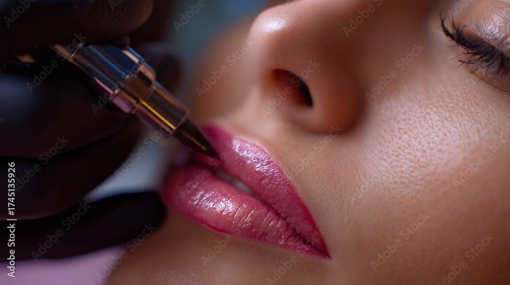 A gloved hand holds a tattoo needle as the tattoo needle approaches the skin. The gloved hand carefully positions the tattoo needle in preparation for inking. #1745135926
