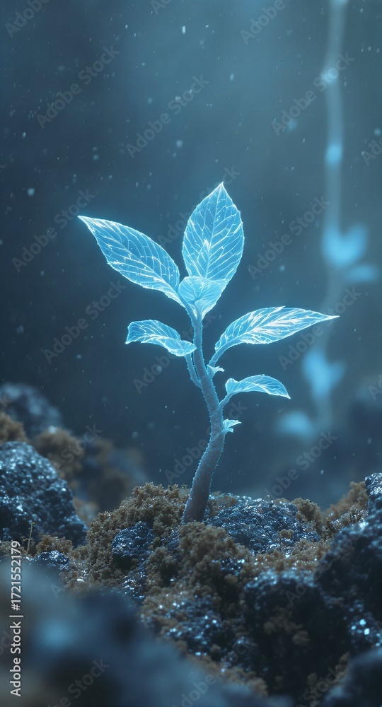 A glowing, bioluminescent plant with translucent blue leaves growing from dark soil with moss. Creates a magical, mysterious, and natural wonder mood. Vertical format for social media #1721552179
