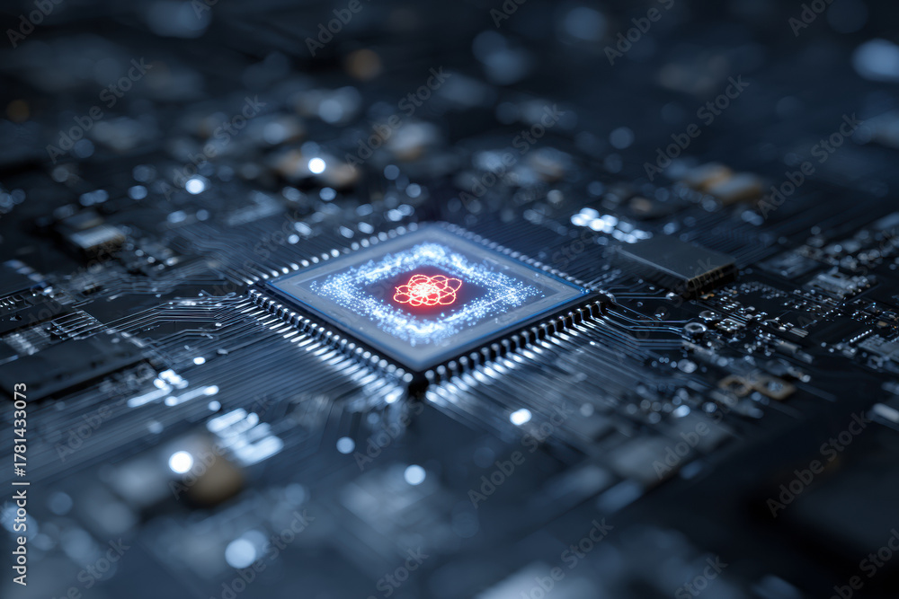A glowing circular processor core on a circuit board, symbolizing artificial intelligence, advanced computing, and digital power systems of the future. #1781433073
