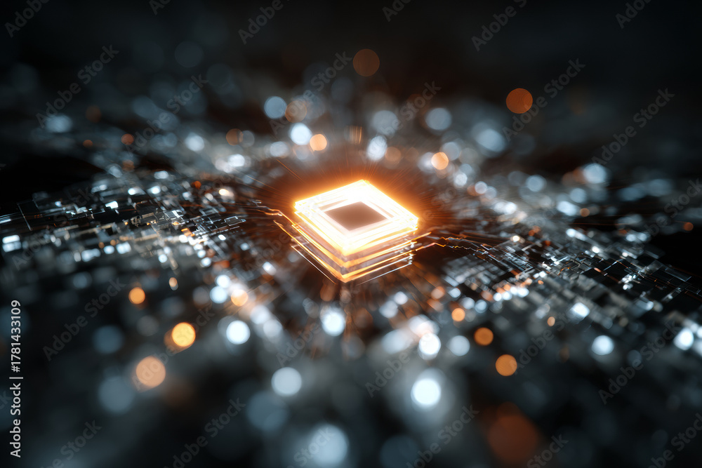 A glowing circular processor core on a circuit board, symbolizing artificial intelligence, advanced computing, and digital power systems of the future. #1781433109