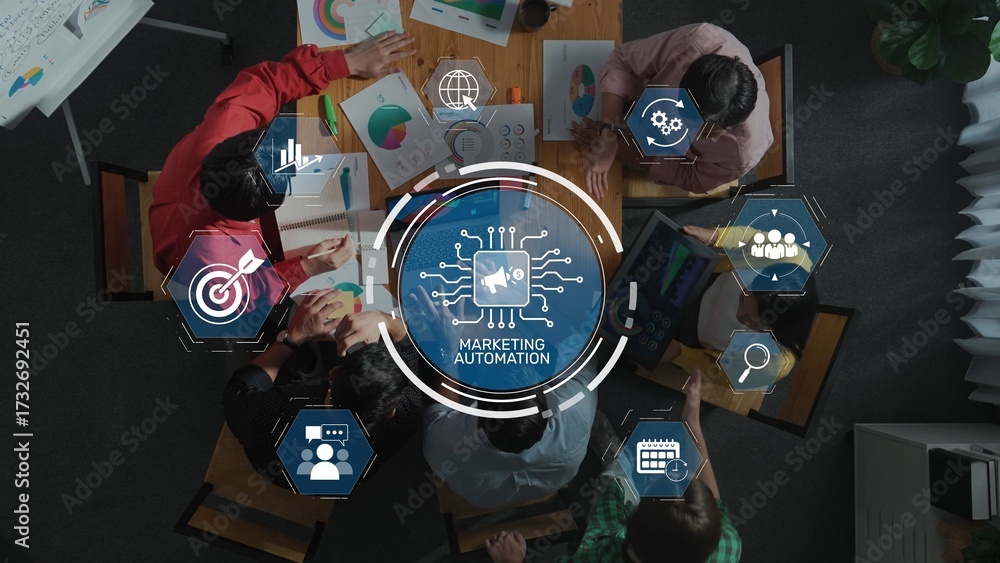 A group of diverse professionals in a modern office setting collaborate on marketing automation strategies, utilizing data analysis and creative brainstorming for success. Raster #1732692451