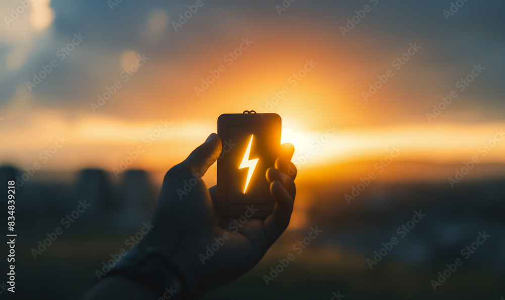 A hand holding a battery with a glowing lightning bolt symbol against a sunset backdrop, symbolizing clean energy and solar power #834839218