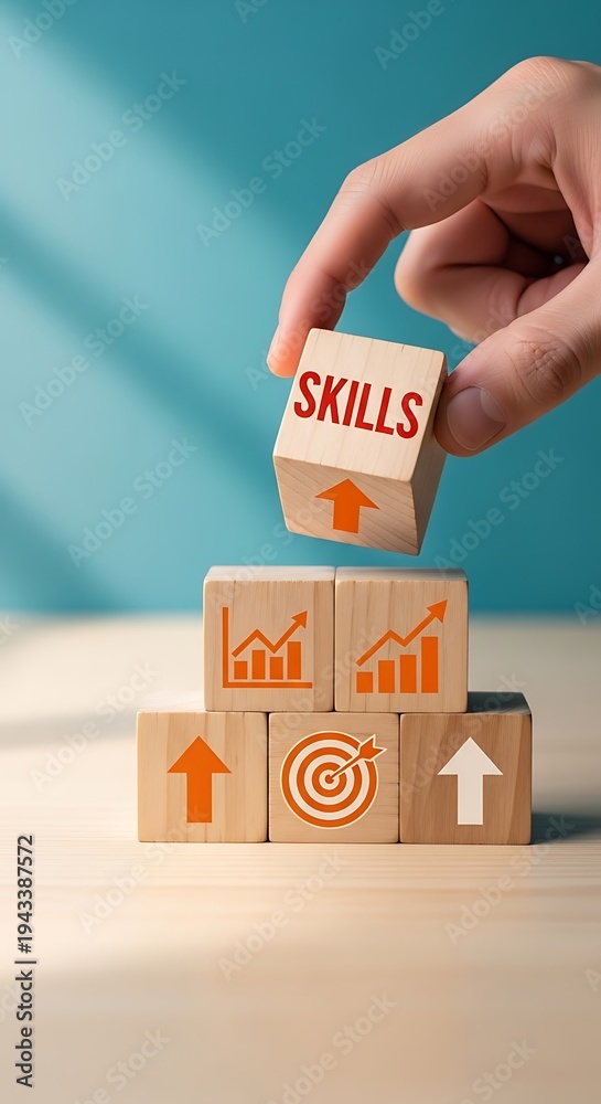 A hand placing a wooden block with the word skills on top of a stack of blocks with various business and growth icons #1943387572