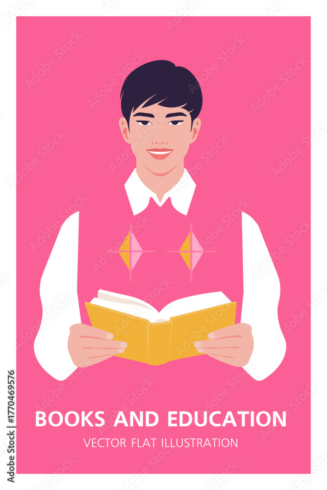 A happy Asian man is holding an open book in his hands. A student, a young teacher. Concept of education and knowledge. Libraries and bookstores. Vector flat illustration #1770469576