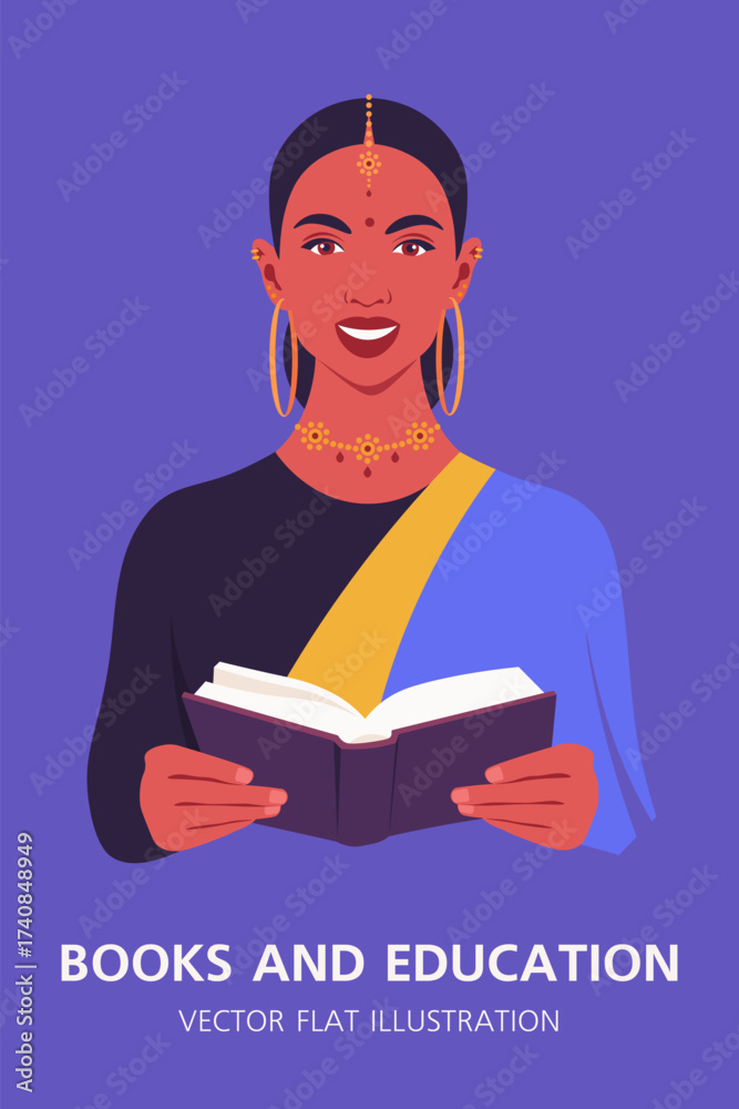 A happy Indian woman is holding an open book in her hands. Concept of education, learning and knowledge. Libraries and bookstores. Vector flat illustration #1740848949
