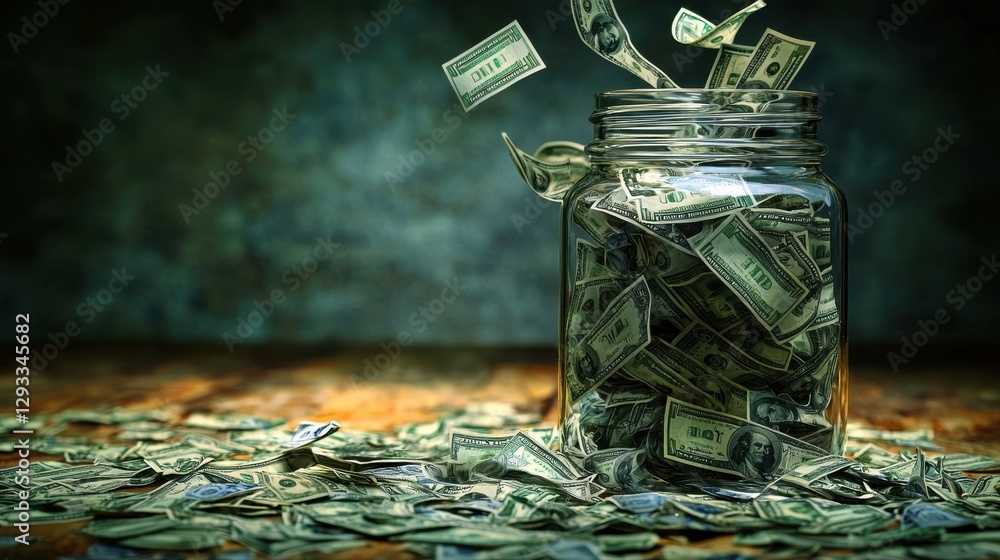 A jar filled to the brim with money representing wealth accumulation and financial success in a clear container #1293345682