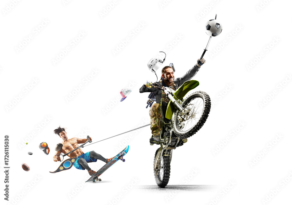 A joyful collage of several sports combined in one person. Boxing, gym, soccer, cycling, hockey, basketball, American football, skateboarding, volleyball, baseball, fitness, etc. Isolated on a white b #1726115030