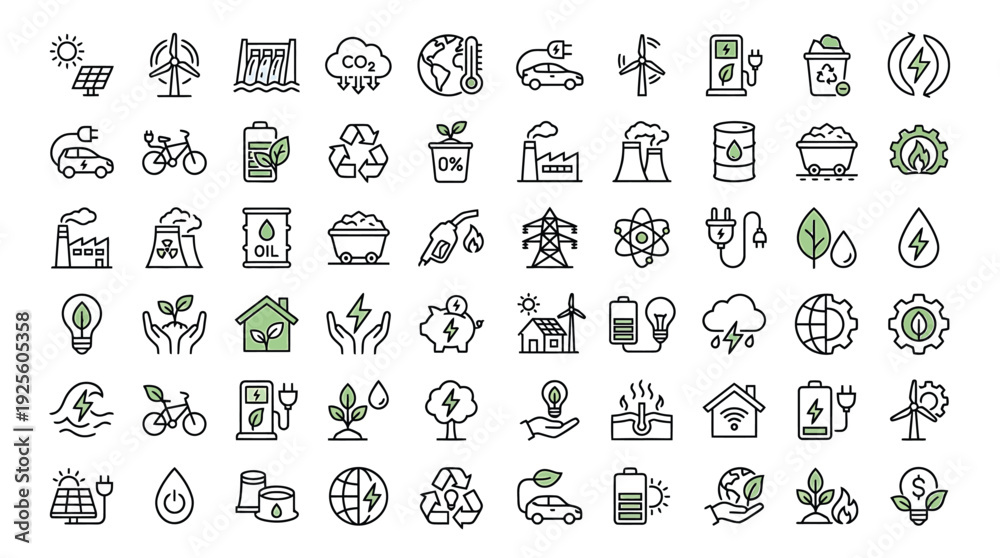 A large assortment of sixty renewable energy and sustainability icons features symbols for solar power, wind turbines, recycling, and environmental protection efforts. #1925605358