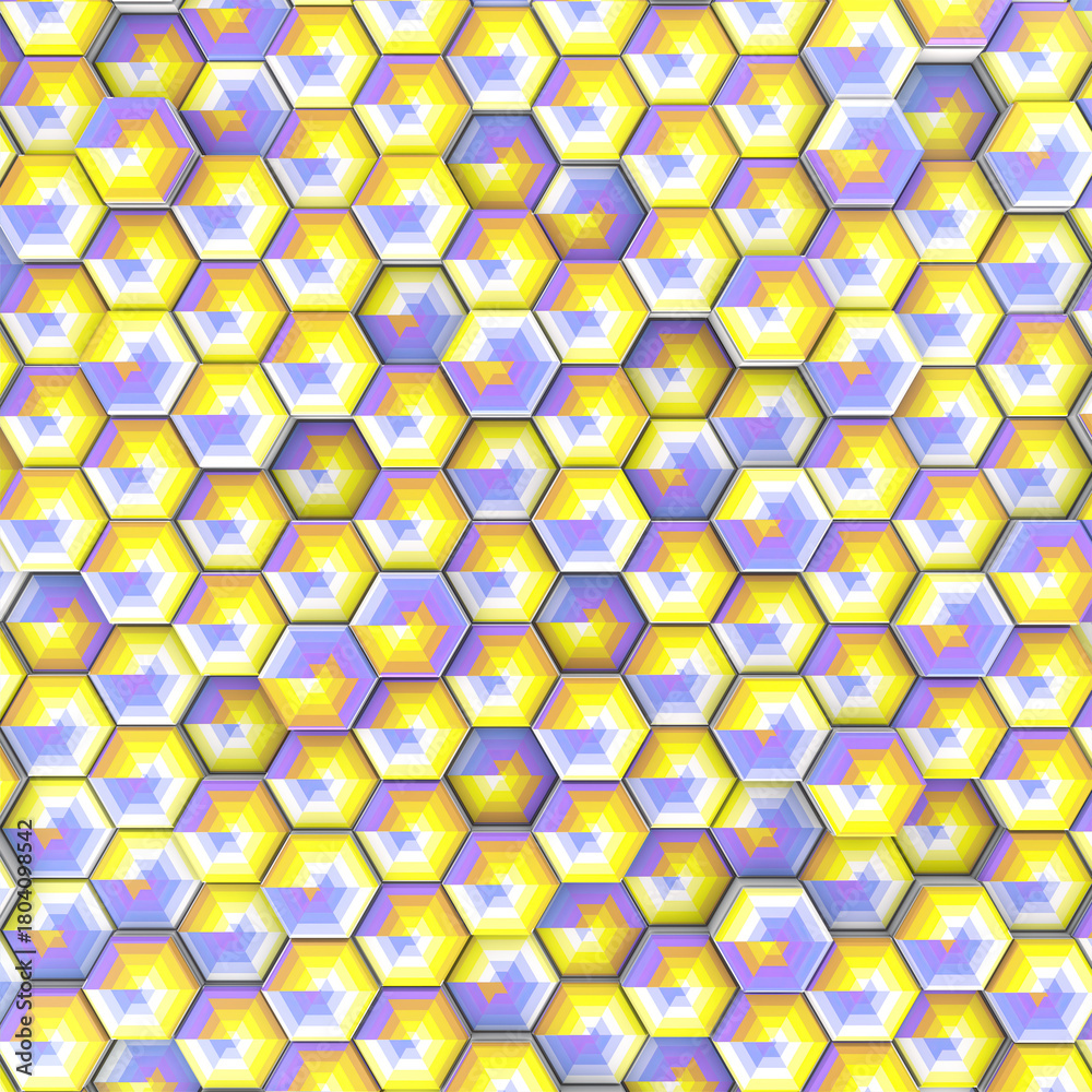 A light, abstract background featuring hexagons in shades of yellow, lilac, and white. It is perfect for light, airy, and positive designs, ranging from technology to summer themes. 3d rendering #1804098542
