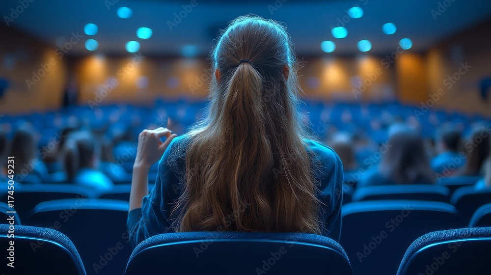 A long-haired audience member shows focus and excitement at a captivating contemporary event #1745049231