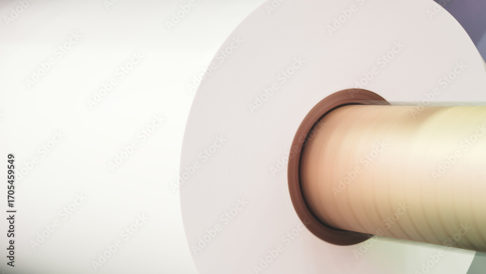 A machine with a roll of polyethylene plastic wrapping film on it. The machine is in a factory. industrial food packaging concept background. #1705459549