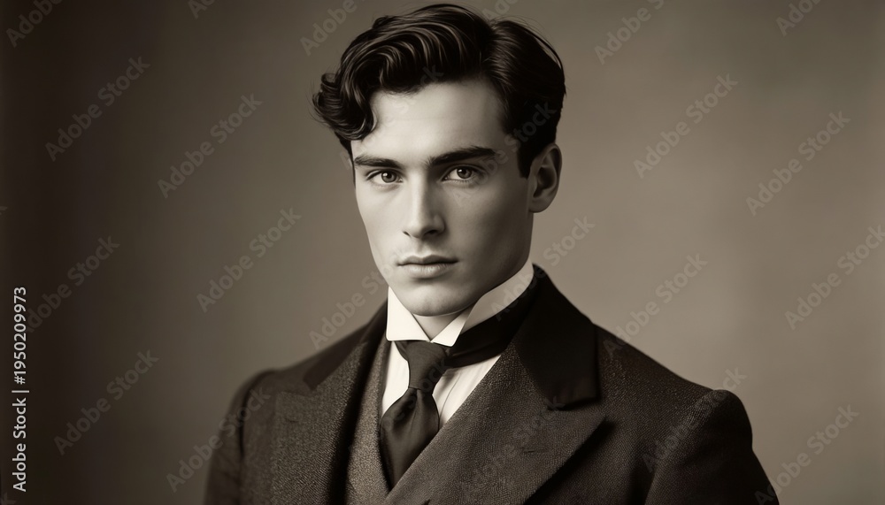 • #1950209973 A man is portrayed in a formal, vintage style. The man has neat hair and wears a dark suit, conveying a classic sophistication in .