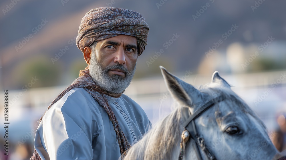 A man wearing a turban rides a horse, and the horse moves under the man's guidance. The man in traditional attire and the horse are part of an outdoor scene. #1758503835