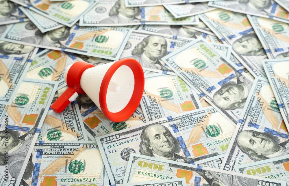 A megaphone against a backdrop of dollars. Pour money into advertising and information dissemination. Concept of marketing investment, digital promotion, brand awareness. Media strategy, PR spending #1743993467