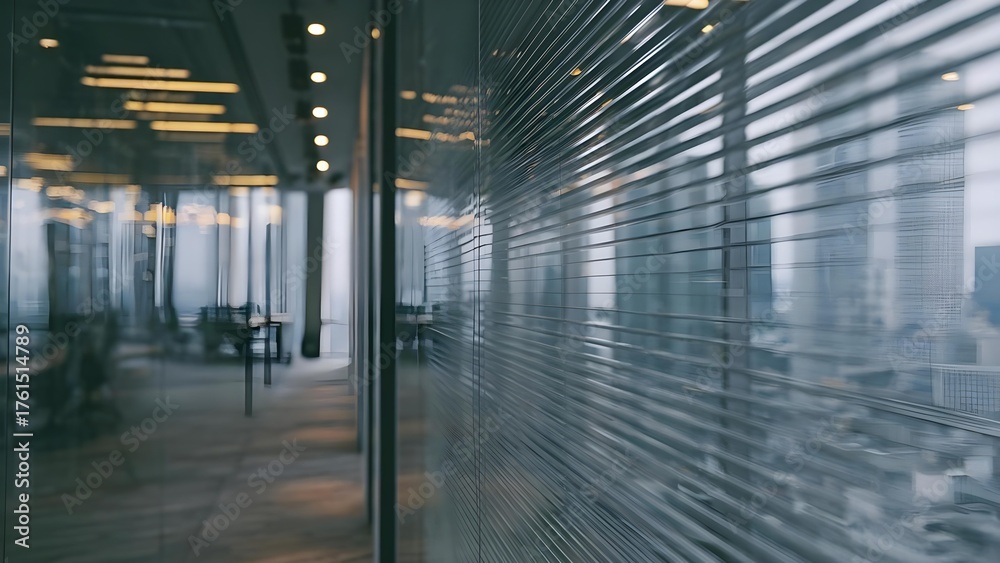 A modern office corridor seen through glass walls with horizontal striped panels, reflections and warm overhead lighting. Concept Modern office corridor, Glass walls and reflections #1761514789