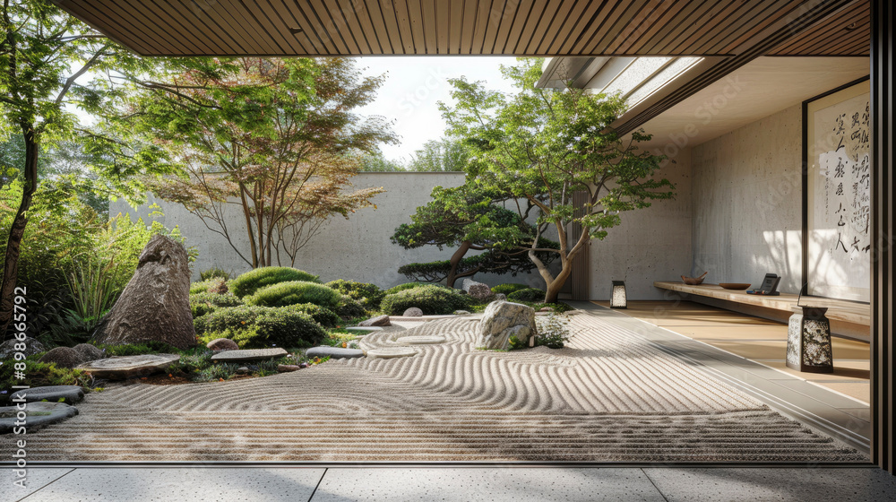 A peaceful Zen garden with meticulously arranged sand patterns, rocks, and greenery, exemplifying tranquility and Japanese landscaping aesthetics. #898665792