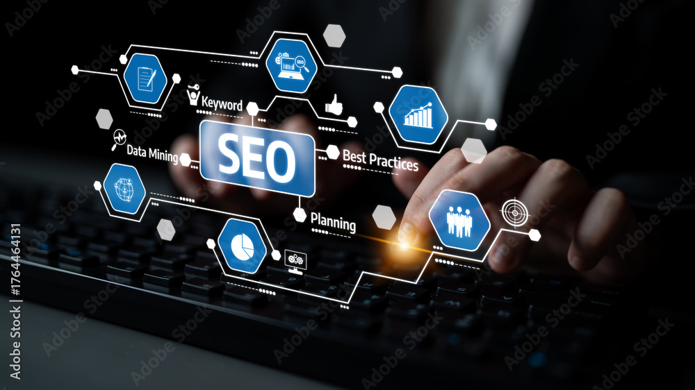 A professional scene depicting hands typing on a keyboard surrounded by SEO-infographics, illustrating data mining, planning strategies, and best practices for enhanced digital marketing. Tessel #1764464131