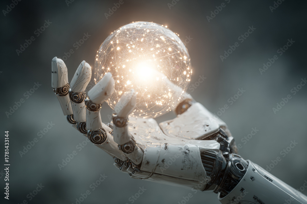 A robotic hand gently holding a glowing energy sphere, symbolizing artificial intelligence, technological power, and the fusion of machine and innovation. #1781433144
