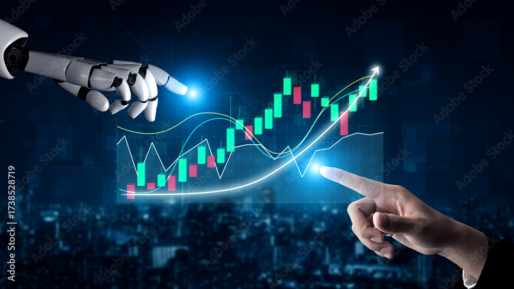 A robotic hand interacts with a digital interface displaying stock market trends and financial data, symbolizing technology role in investment analysis and growth. Impute #1738528719