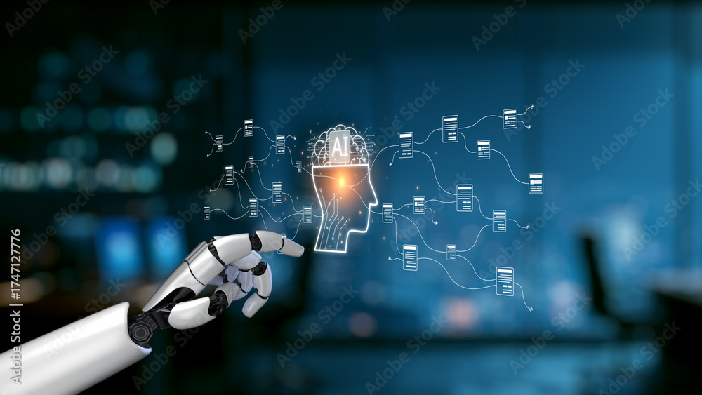A robotic hand points towards a digital depiction of artificial intelligence in a contemporary workspace, showcasing innovation and technology advancement in action. Synapse #1747127776