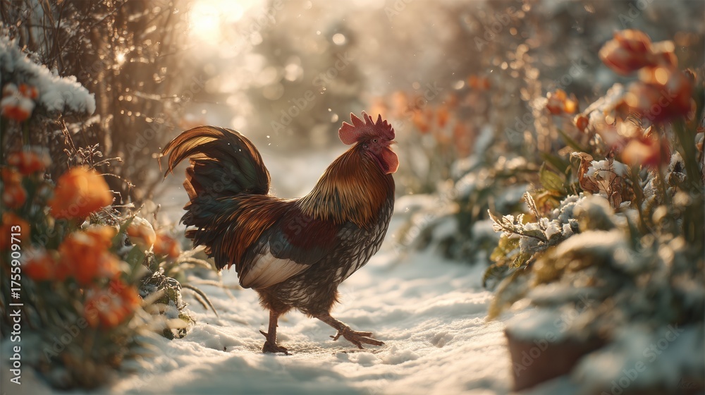 A rooster struts through a snowy garden, with the rooster surrounded by snow and flowers. The rooster's vibrant feathers stand out against the winter scene as the rooster moves gra #1755909713
