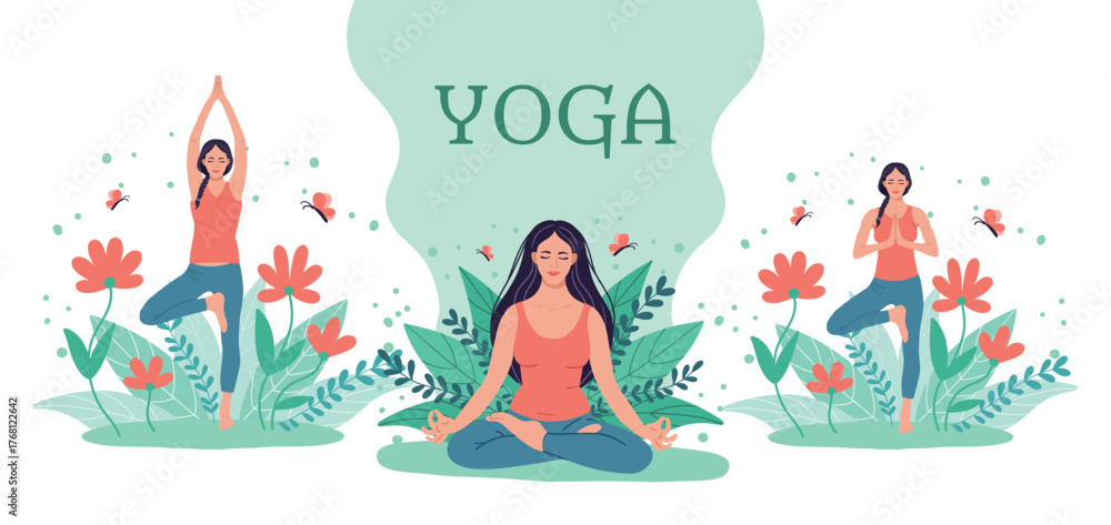 A set of beautiful girls doing yoga and meditating. A girl sits in the lotus position and meditates. Yoga. Beautiful background with leaves and flowers. #1768122642