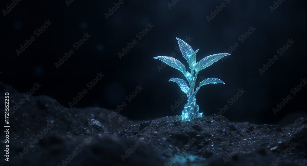 A single, elegant plant made of glowing, translucent blue crystals growing from dark soil. A symbol of future biology, biotechnology, and alien flora. Dark, minimalist, and cinematic background #1721552250