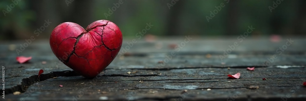 A single, withered heart rests on aged, cracked wood, symbolizing profound loneliness and emotional isolation; a poignant image of solitude and sorrow , solitude, isolation #1510832757