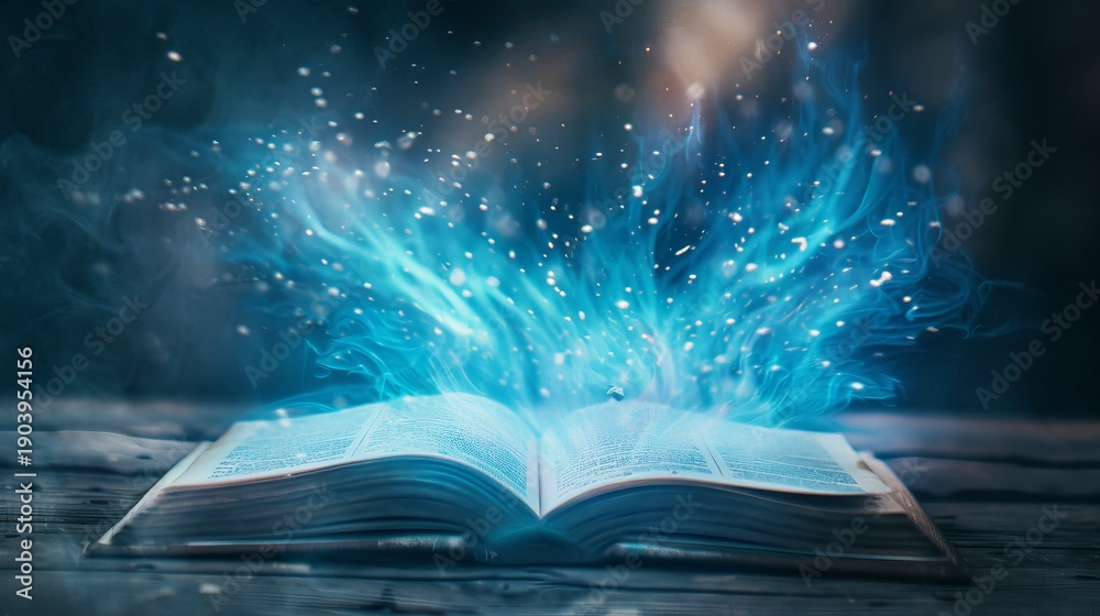A spellbook opens by itself with pages turning as magical light emits from it in a dimly lit room filled with mystery and enchantment #1903954156