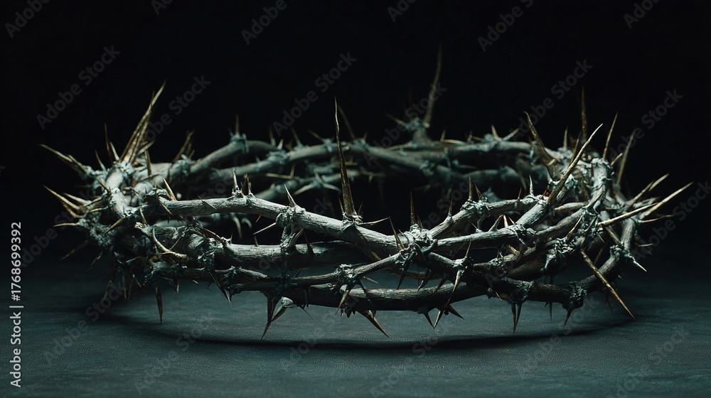 A stark crown of thorns sits against a dark backdrop, its sharp points radiating outwards. Symbolizing sacrifice, it evokes feelings of pain, sorrow, and reflection on deeper themes. #1768699392