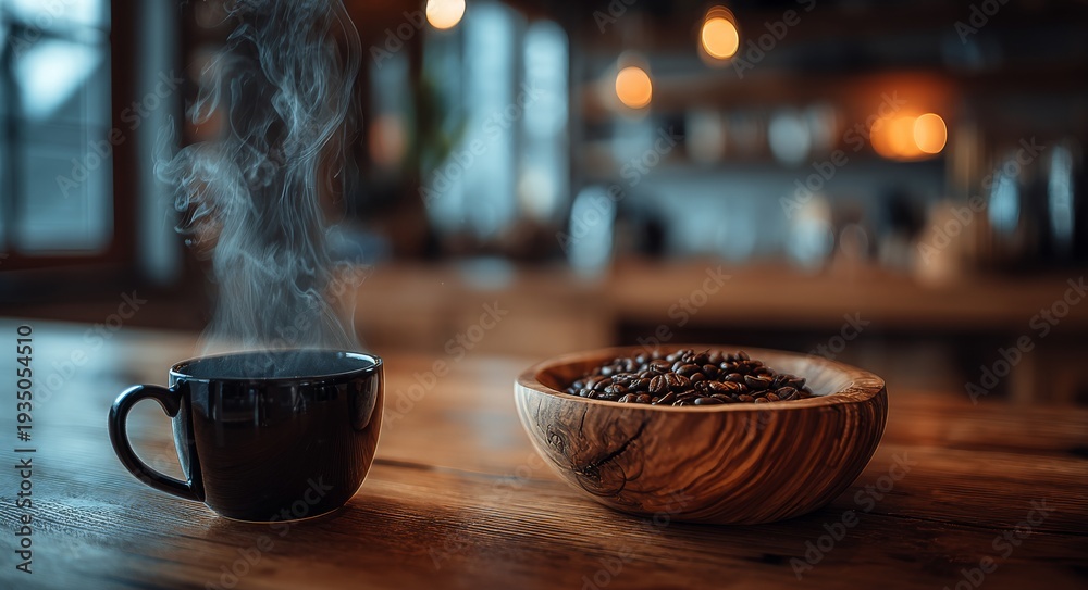 A steaming drink sits in a dark mug next to a wooden bowl brimming with roasted coffee beans on a bright countertop #1935054510