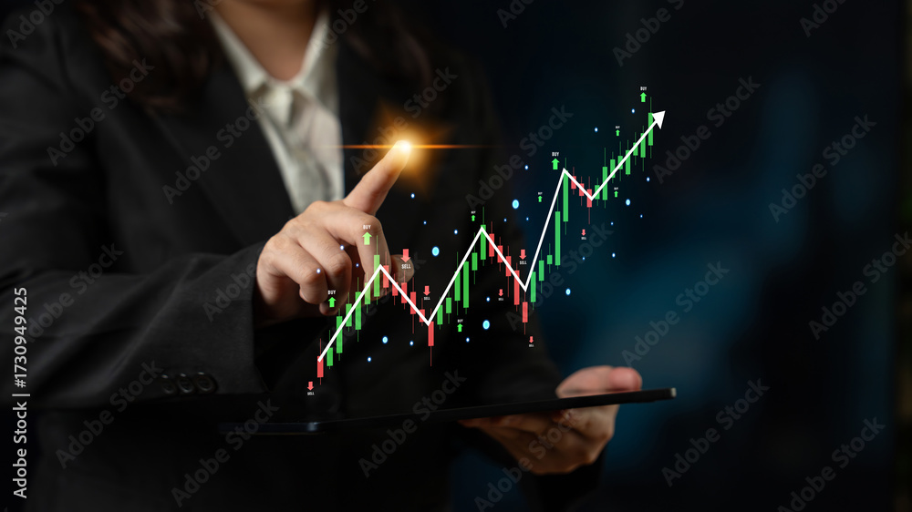 A stock market trading candlestick chart showing a bull market trend. A concept of financial investment with technical analysis and trading signals. Motif #1730949425