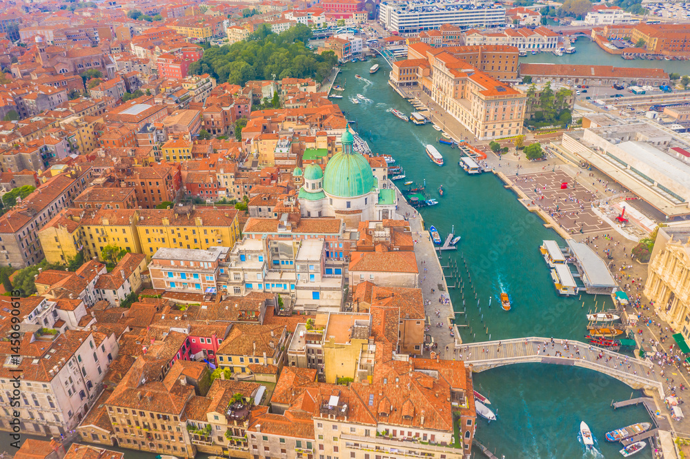 A striking aerial view of Venice’s central railway station (Stazione di Venezia Santa Lucia) and its position along the Grand Canal, showing boats, bridges, and the historic charm #1450690613
