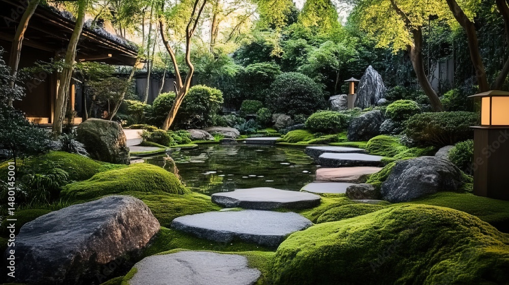 A traditional Japanese garden with stepping stones and moss-covered rocks #1480145001