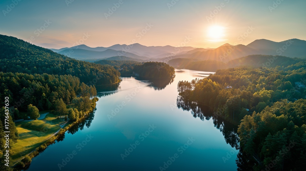 A tranquil lake reflects the vibrant colors of the sunset as it rests between green hills. The peaceful lake setting is surrounded by lush trees and distant mountains. #1776437630