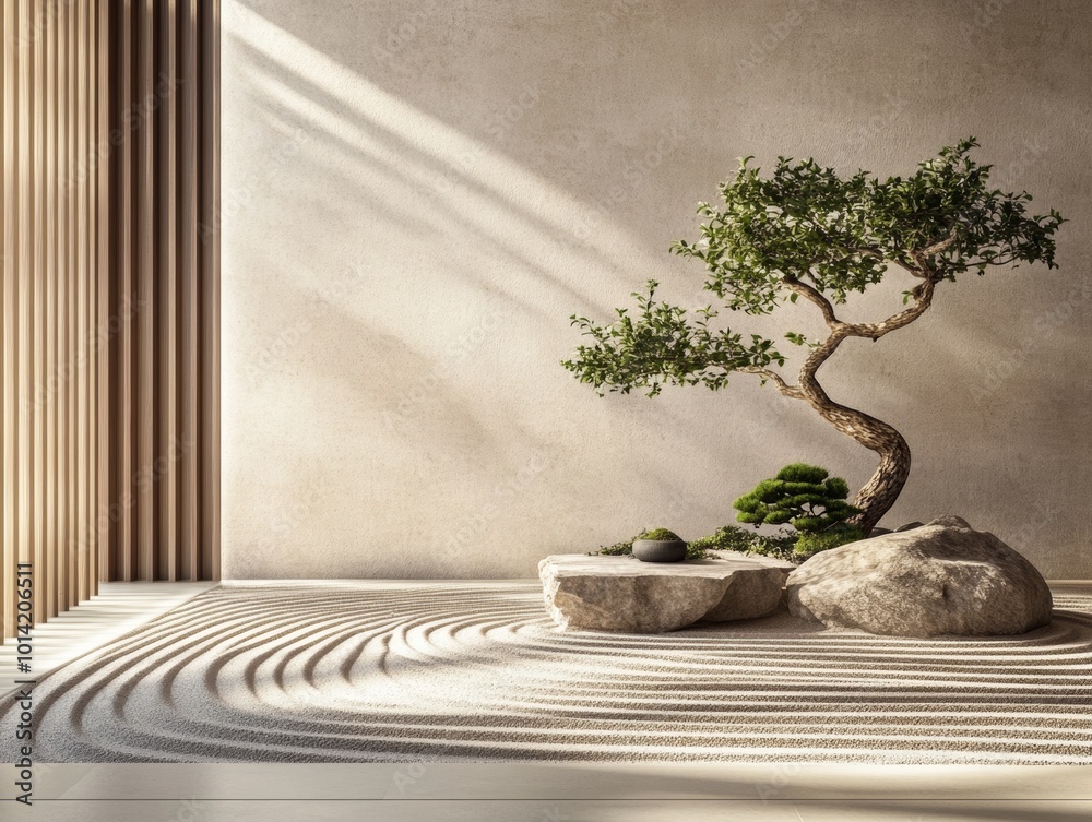 A tranquil zen garden featuring raked sand patterns, smooth stones, and a solitary bonsai tree under gentle sunlight #1014206511
