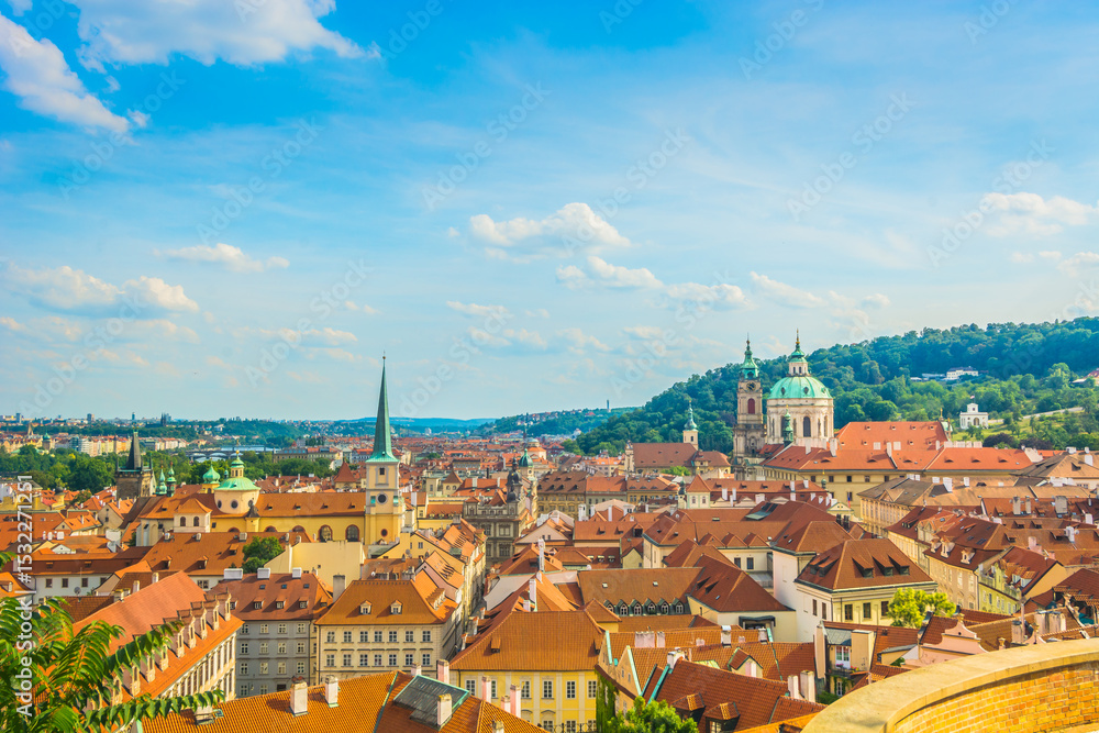 A vibrant HDR aerial image of Prague’s city center, highlighting the city's rich architectural heritage with Gothic spires, and Baroque façades, glowing under the clear blue sky #1532271251
