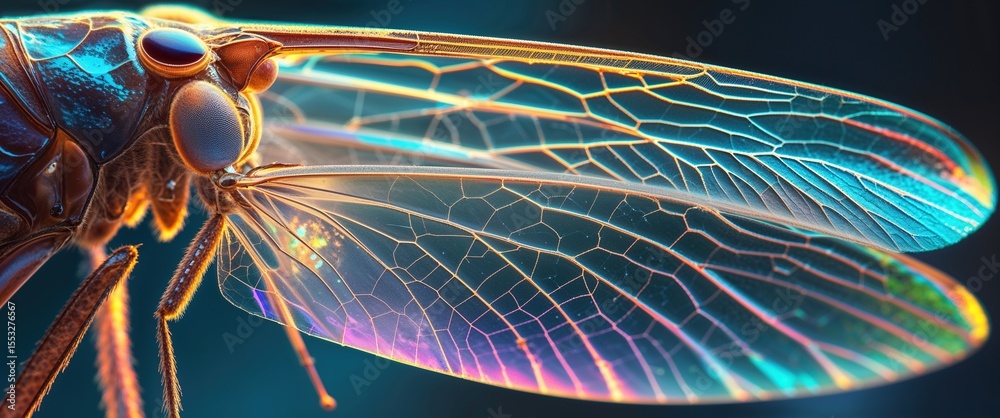 A vibrant insect with iridescent wings reveals a surreal world where colors blend beautifully. The intricate patterns and structures highlight the marvel of nature, inviting curiosity and wonder #1553276567