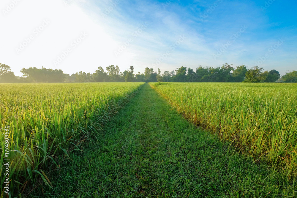 A winding path through a green rice field under a blue sky with clouds #1774309530