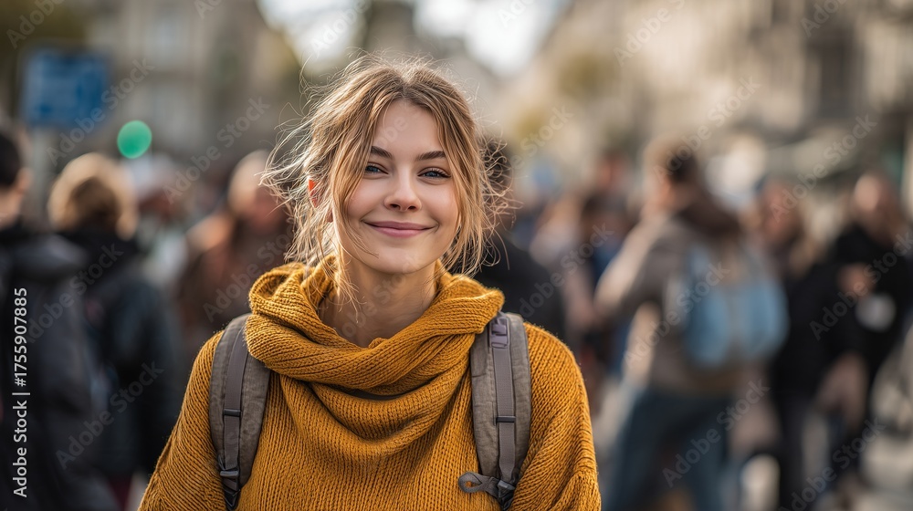 A woman in a mustard sweater stands with a backpack as the woman blends into the bustling crowd. The woman observes the busy scene, her sweater catching the sunlight. #1755907885